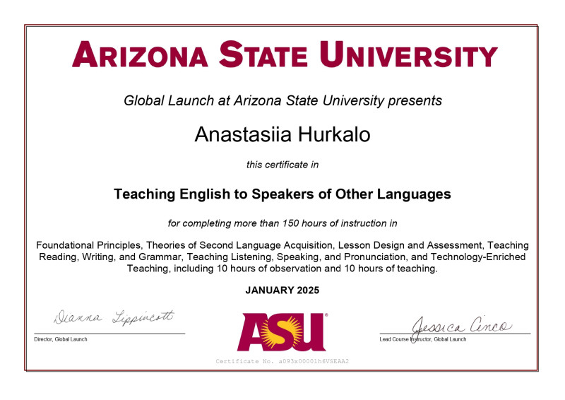 Я преподаватель английского языка с дипломом педагога и сертификатом TESOL от Аризонского государственного университета. Более всего люблю помогать студентам чувствовать себя уверенно при общении на английском. Особое внимание уделяю произношению, в частности американскому варианту, ведь уверена: правильная интонация и звуки делают язык по-настоящему живым. Мне нравится показывать, что грамматика — это не только система правил, но и неотъемлемая часть реального общения.