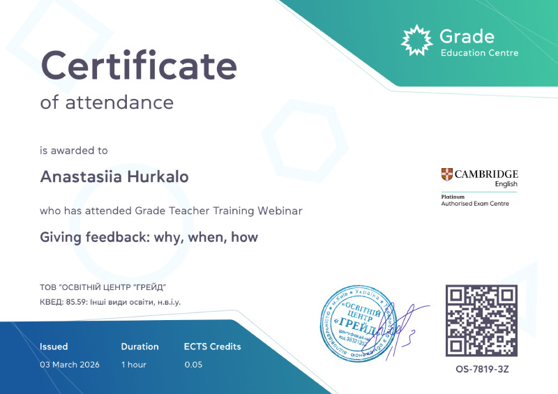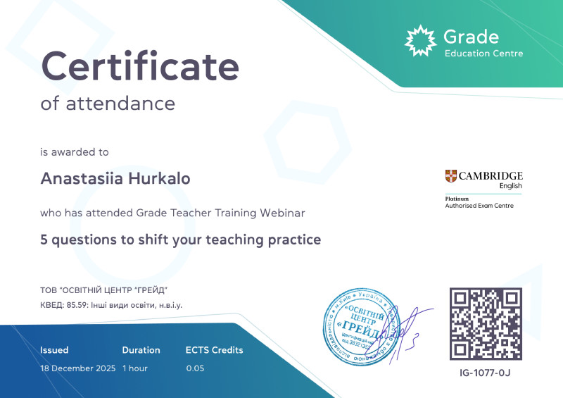 Использую свой опыт и знания методики, чтобы сделать сложное простым и помочь студентам говорить уверенно и естественно. Регулярно общаюсь с носителями английского, выполняю устные и письменные переводы — это помогает мне поддерживать высокий уровень владения языком и оставаться в контексте современной речи.